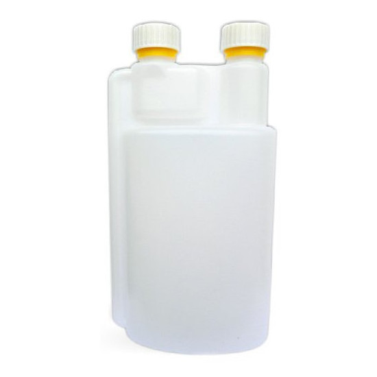 Plastová lahev má dva uzávěry s možností dávkování dezinfekčních přípravků. Na lahvi vyznačena odměrka 10-50ml.