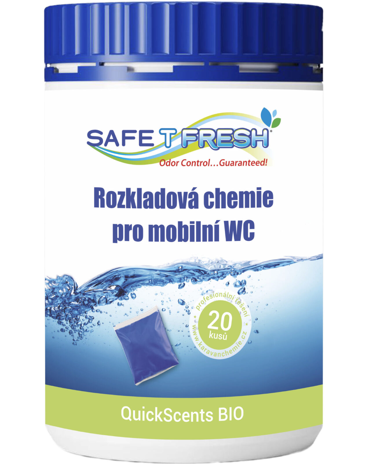 Quick Scents BIO. Rozkadová chemie vhodná pro domácí čističky a septiky. Kapsle s kompletním přírodním složením šetrné k životnímu prostředí, ideální pro používání při běžné teplotě pro denní údržbu vaší toalety. Speciální patentovaná chemická formule Triple Molecular Technology pro uvolňování biocidů v odstupňovaných intervalech zajišťuje rozklad fekálií, vynikající ochranu proti zápachu toalety v uzavřených prostorech, zabraňuje usazování nečistot na stěnách nádrže, vytváří dlouhotrvající modrou barvu. Náš jedinečný vnější film se rychle rozpouští v kombinaci s měkkým, vysokým nebo nízkým pH i tvrdou vodou. Při použití slané vody budou kapsle Safe-T-Fresh fungovat na vyšší úrovni. Neobsahuje formaldehyd.